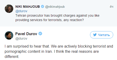 Основатель Telegram выразил удивление в связи с предъявленными обвинениями. "Мы активно блокируем террористический и порнографический контент в Иране. Думаю, подоплека у дела другая", - написал он в Twitter.