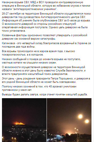 О возможности совершения диверсии на территории области именно в этот день было известно Службе безопасности, и власть сделала масштабный поиск диверсантов. Этот день - день рождения президента Петра Порошенко, и диверсия в его родной Винницкой области не может быть совпадением. Поэтому никаких сомнений в том, что 48 арсенал уничтожен противником у меня нет", - написал Бутусов в Facebook.
