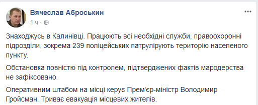 Правоохранители контролируют ситуацию в населенном пункте Калиновка, рядом с которым с вечера, 26 сентября взрываются склады с боеприпасами. Об этом сообщил первый замглавы Нацполиции Вячеслав Аброськин в Facebook.