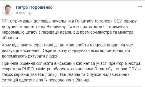 Петр Порошенко, вчера отпраздновавший свой день рождения, только сейчас прокомментировал в Facebook ЧП в Винницкой области, где идет массовая детонация боеприпасов и эвакуация людей. На сайте Администрации президента до сих пор не было информации о произошедшем.