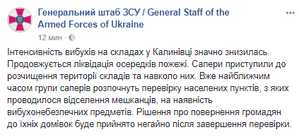"Интенсивность взрывов на составах в Калиновке значительно снизилась. Продолжается ликвидация ячеек пожара. Саперы приступили к расчистке территории складов и вокруг них", - сообщается на странице Генштаба.