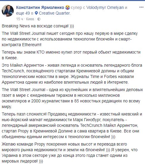 "Теперь пазл сложился! Продавец недвижимости - известный киевский и нью-йоркский магнат недвижимости Марк Гинзбург, покупатель - легендарный американский основатель TechCrunch Майкл Аррингтон, стартап Propy в Кремниевой Долине а сама квартира в Киеве. Все они обьединены единым интересом к технологии блокчейн", - написал Ярмоленко.