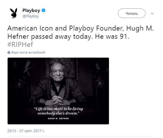 "Жизнь слишком коротка, чтобы жить чужой мечтой", - говорил Хефнер.