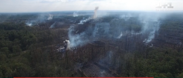 ТСН опубликовал кадры трассы между Калиновкой, Павловкой и Сальником. Как можно увидеть лес дымит, но огня не видно. На фото видны воронки от взрывов и сгоревшие в огне деревья.