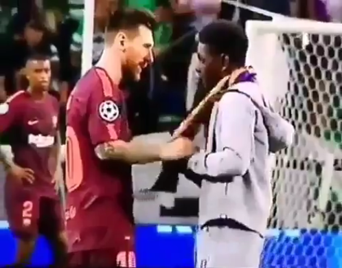 Темнокожий фанат прорвался на поле и бросился с объятиями к Лео Месси. Добежав до своего кумира, он обнял его и начал что-то рассказывать. Лео терпеливо выслушал своего поклонника, который закончив монолог, опустился на колени и поцеловал его бутсу.