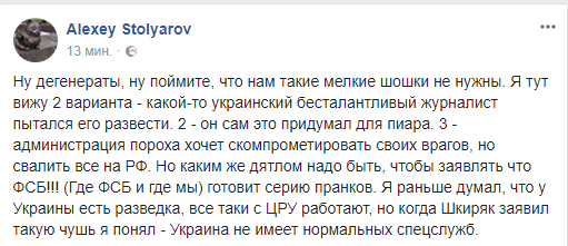 "Ну дегенераты, ну поймите, что нам такие мелкие шошки не нужны. Я тут вижу 2 варианта - какой-то украинский бесталантливый журналист пытался его развести. 2 - он сам это придумал для пиара. 3 - администрация пороха хочет скомпрометировать своих врагов, но свалить все на РФ. Но каким же дятлом надо быть, чтобы заявлять что ФСБ! (Где ФСБ и где мы) готовит серию пранков. Я раньше думал, что у Украины есть разведка, все таки с ЦРУ работают, но когда Шкиряк заявил такую чушь я понял - Украина не имеет нормальных спецслужб", - написал Столяров.