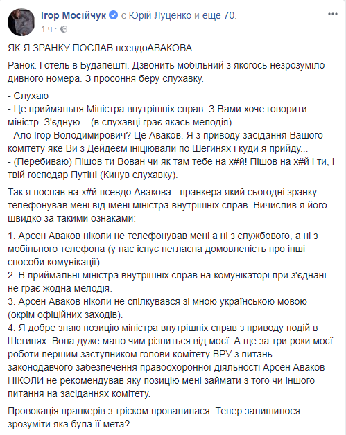 Так я послал на х#й псевдо Авакова - пранкера, который сегодня утром звонил мне от имени министра внутренних дел", - пишет Мосийчук.