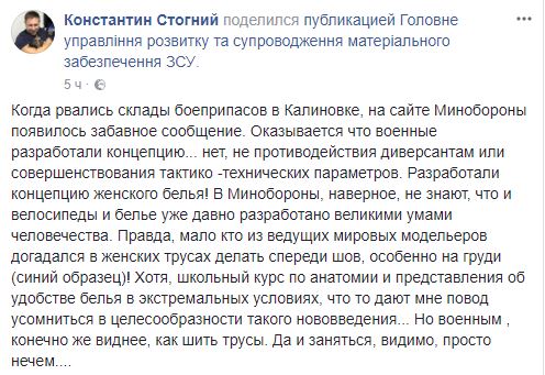"И еще один ужас, они за наши деньги хотят одеть женщин военослужащих в трусы со швом в промежности и вот в эти, боюсь этого слова Топы. И еще спорят с коментаторками. Очень хочется знать, кто ж автор белья. Но один плюс, у них видимо время отчета пришло, поэтому вот напостили, хорошо, что не отшили на 30 тысяч. Ну и второй плюс, что за четыре года дошло до кого то, что женщины тоже воюют", - пишет херсонская активистка Наталья Астасьева-Блок.