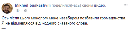 Экс-глава Одесской ОГА Михаил Саакашвили утверждает, что после критики президента Украины Петра Порошенко относительно его визита в США летом и после заявления о внеочередных выборах, он был лишен украинского гражданства. Соответствующее видео появилось на его странице в Facebook.