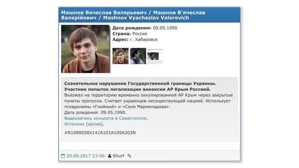 Рэп-исполнитель Вячеслав Машнов, который известный под псевдонимом Гнойный, был внесен в базу сайта "Миротворец". Об этом сообщается в соответствующем разделе на сайте.
