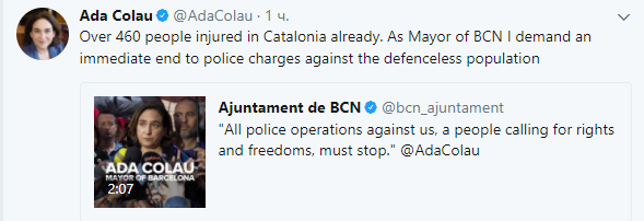 "В Каталонии получили ранения уже более 460 человек. Как мэр Барселоны я требую немедленно положить конец действиям полиции против беззащитного населения", - сообщила Колау.