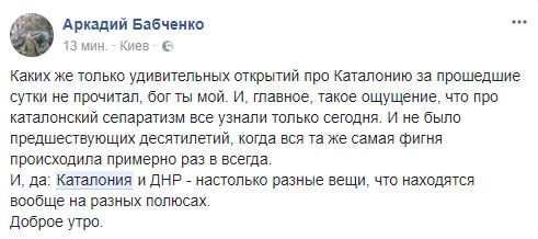 Аркадий Бабченко, журналист: "Каких же только удивительных открытий про Каталонию за прошедшие сутки не прочитал, бог ты мой. И, главное, такое ощущение, что про каталонский сепаратизм все узнали только сегодня. И не было предшествующих десятилетий, когда вся та же самая фигня происходила примерно раз в всегда. И, да: Каталония и ДНР - настолько разные вещи, что находятся вообще на разных полюсах".