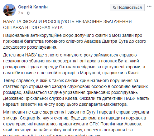 "Детективы НАБУ еще с февраля прошлого года занимаются делом незаконного обогащения оборотня и олигарха в погонах Бута, который раздаривает и сдает в аренду родителям неизвестно за что купленные хоромы, а сам якобы обитающей в не своей квартире в Мариуполе, работая в Киеве", - пишет Каплин.
