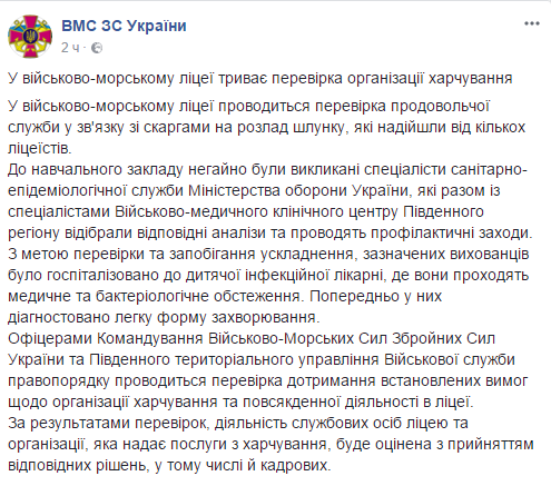 В военно-морском лицее Одессы проходит проверка организации питания после жалоб лицеистов на симптомы отравления. Об этом сообщили в пресс-службе ВМСУ в Facebook.
