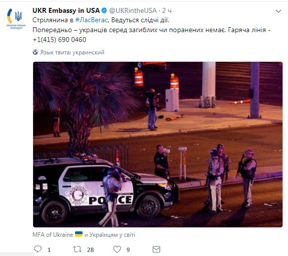 Посольство Украины в США заявляет, что по предварительной информации граждан Украины нет среди пострадавших в результате стрельбы на музыкальном фестивале в Лас-Вегасе (США).