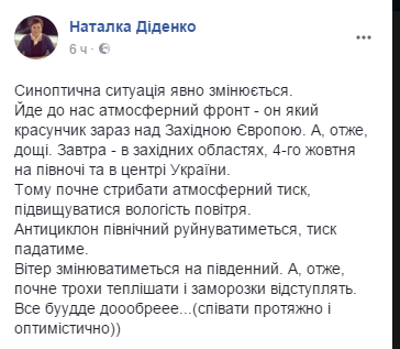"Идет к нам атмосферный фронт - вон какой красавец сейчас над Западной Европой. А, следовательно, дожди. Завтра - в западных областях, 4 октября на севере и в центре Украины", - рассказала Диденко.