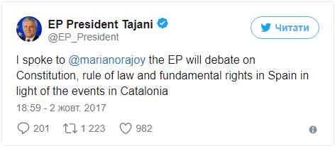 "Я общался с премьер-министром Испании Мариано Рахоем. Европарламент проведет дебаты по Конституции, верховенству права и фундаментальным правам человека в Испании в свете событий в Каталонии", - сообщил Таяни.
