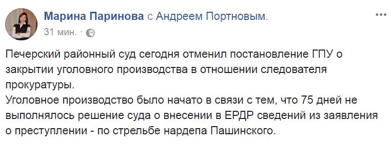 "Уголовное производство было начато в связи с тем, что 75 дней не выполнялось решение суда о внесении в ЕРДР сведений из заявления о преступлении - по стрельбе нардепа Пашинского", - написала она.
