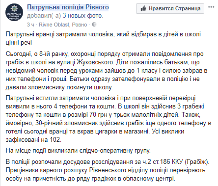 Патрульные города Ровно сегодня утром задержали 30-летнего мужчину, который отбирал у первоклашек в школе ценные вещи. Об этом полиция сообщает в Facebook.