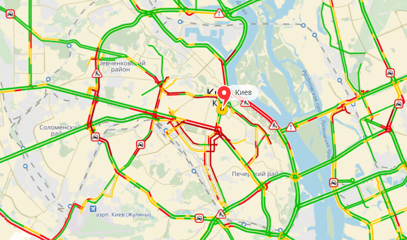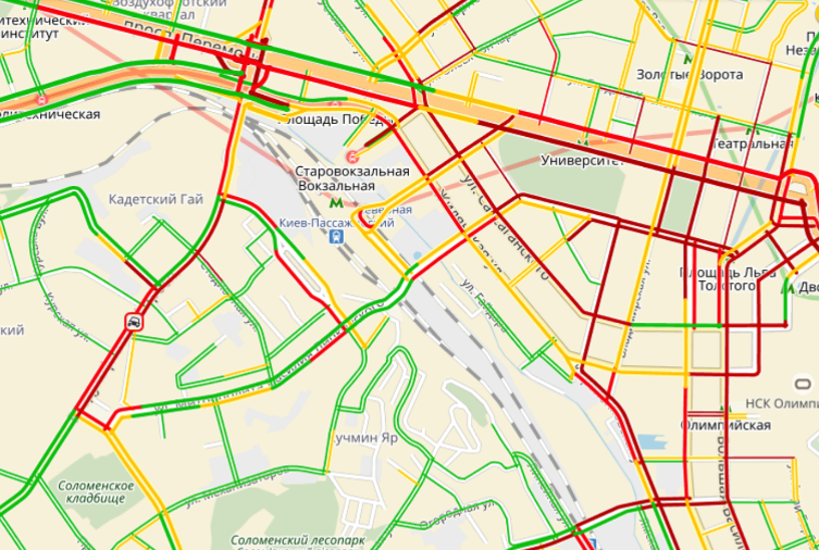 На левом берегу из-за ДТП и дорожных работ заторы сформировались на проспекте Гагарина, улице Виталия Шимановского, в районе Дарницкой площади.
