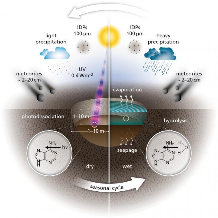 Авторы новой работы использовали данные физической химии и астрофизики и на их основе построили модель того, как в теплых мелких водоемах могли образовываться нуклеотиды, а из нуклеотидов - РНК. По их расчетам, космическая пыль не могла быть источником азотистых оснований, так как не содержала их в нужных количествах. Зато этой цели могли послужить метеориты, которые крайне часто падали на планету в период поздней тяжелой бомбардировки. По всей видимости, они попадали во многие водоёмы, привнося туда компоненты для синтеза нуклеотидов.