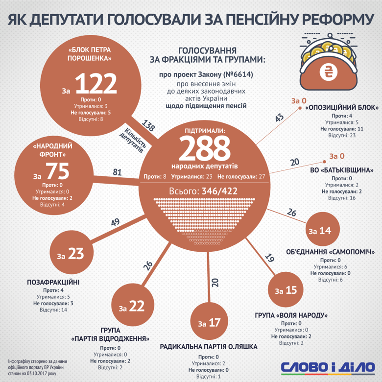 Напомним, "за" проголосовали сразу 288 депутатов, при минимально необходимых 226. Несмотря на то, что "Оппоблок" не поддержал законопроекта с изменениями в пенсионное законодательство. Так же ни одного голоса не дала фракция "Батькивщины".