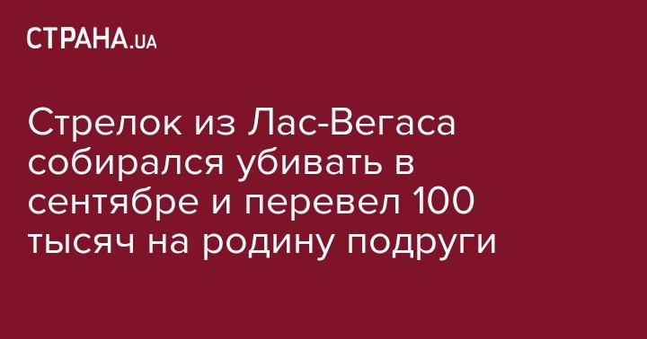Также устроивший стрельбу в американском Лас-Вегасе (штат Невада) Стивен Пэддок на прошлой неделе перевел $100 тыс. на банковский счет на Филиппинах, где в день трагедии 1 октября находилась его подруга 62-летняя Мэрилу Дэнли. Об этом сообщила во вторник телекомпания NBC со ссылкой на источники в американских правоохранительных органах.