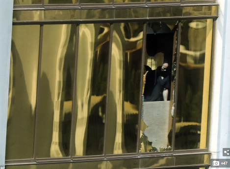В объектив также попали десятки гильз и топор, которым Пэддок, возможно, выбил стекло из окна своей комнаты.