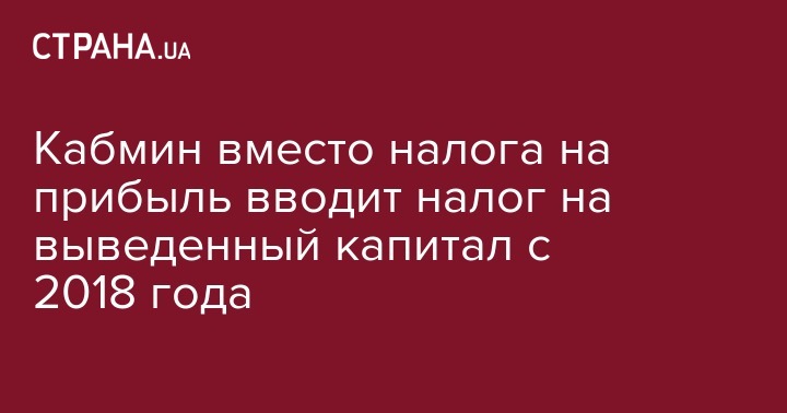 Правительство одобрило законопроект о налоге на выведенный капитал, который должны ввести в 2018 году вместо налога на прибыль предприятий. Премьер Украины Владимир Гройсман поручил проработать этапность внедрения. Об этом сообщает "Интерфакс-Украина".