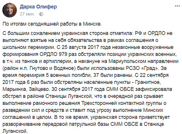 Об в среду, 4 октября на Фейсбук-странице сообщила пресс-секретарь представителя Украины в Трехсторонней контактной группе в Минске Леонида Кучмы Дарка Олифер.