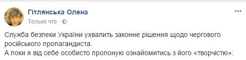 "Служба безопасности Украины примет законное решение в отношении очередного российского пропагандиста", - написала Гитлянская в Facebook и приложила видео 2016 года, где Немышев в Донбассе рассказывает, как СБУ вербует школьников в "диверсанты".