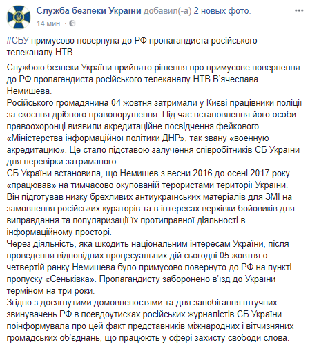 СБУ принудительно выдворила в Россию журналиста телеканала НТВ Вячеслава Немишева, которого 4 октября задержали в Киеве работники полиции за совершение мелкого правонарушения. Об этом говорится в сообщении СБУ в Facebook.