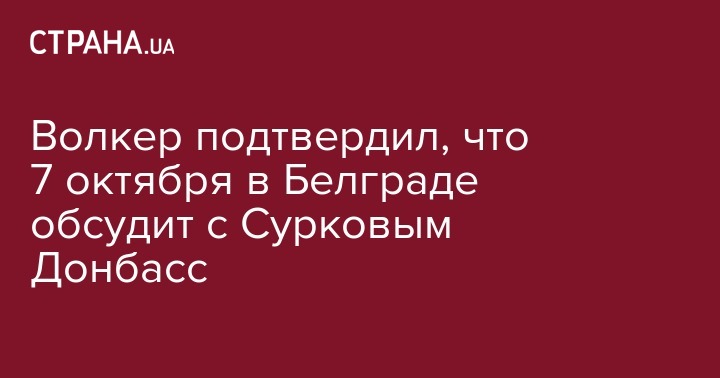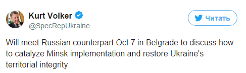 "Встречусь с российским коллегой 7 октября в Белграде, чтобы ускорить исполнение минских соглашений и восстановить территориальную целостность Украины", - написал Волкер в Twitter.