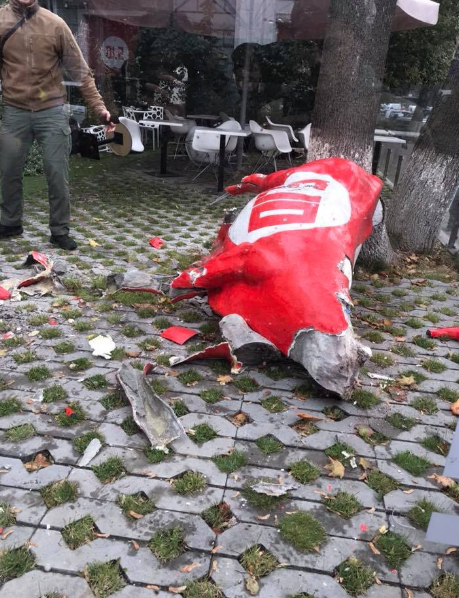 Сообщается, что один из националистов разломал корову с надписью 5.10 топором. Также разгромлена клумба и летняя площадка около офиса партии. Частично поврежден и сам офис.