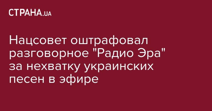 Национальный совет Украины по вопросам телевидения и радиовещания, по результатам внеплановой проверки оштрафовал ООО "Телерадиокомпания "Радио-Эра" (Киев) на 317,438 тыс. грн. за несоблюдение требований законодательства по обязательной квоте украиноязычных песен в эфире. Об этом сообщается на официальном сайте Нацсовета.