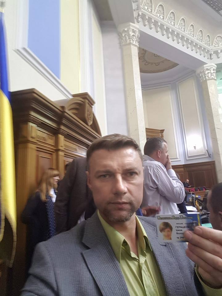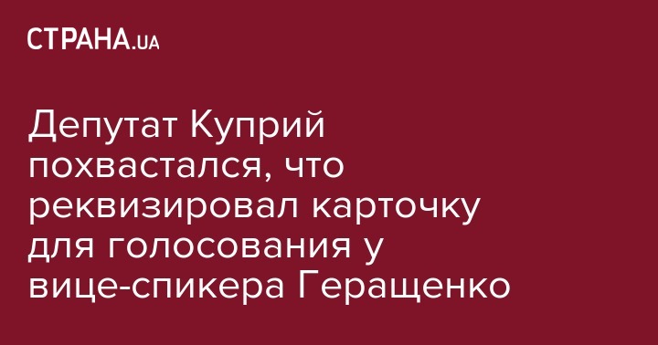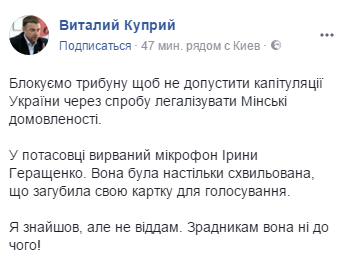 Также он похвастался, что в потасовке вырвал микрофон у Ирины Геращенко,  также забрал ее карточку для голосования. "Она была настолько взволнована, что потеряла свою карточку для голосования. Я нашел, но не отдам. Предателям она ни к чему!", - заявил Куприй.