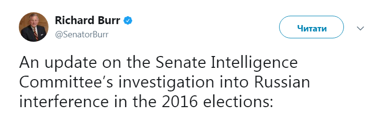 В среду, 4 октября 2017 года сенатор от Республиканской партии США Ричард Бёрр заявил, что Россия вмешивалась в президентскую избирательную компания в США, но на итогах голосования это никак не сказалось.