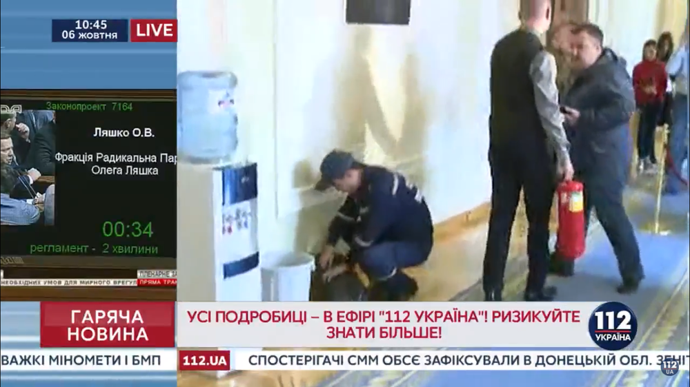 Раду затянуло дымом из шашки, чувствуется запах. В кулуарах оперативно появились сотрудники чрезвычайных служб. Некоторые депутаты начали покидать сессионный зал.
