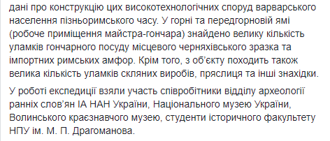 "В работе экспедиции приняли участие сотрудники отдела археологии ранних славян Института археологии НАН Украины, Национального музея Украины, Волынского краеведческого музея, студенты исторического факультета НПУ им. Драгоманова", - добавили археологи.