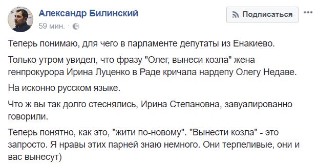 "Теперь понимаю, для чего в парламенте депутаты из Енакиево. Только утром увидел, что фразу "Олег, вынеси козла" жена генпрокурора Ирина Луценко в Раде кричала нардепу Олегу Недаве. На исконно русском языке", пишет у себя в Facebook журналист из Горловки Александр Билинский.
