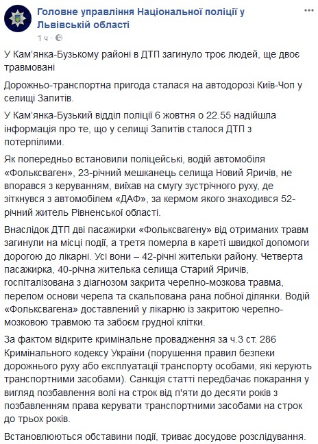 В результате ДТП погибли три женщины - пассажиры легкового автомобиля, все в возрасте 42 лет, жительницы Каменка-Бугского района.