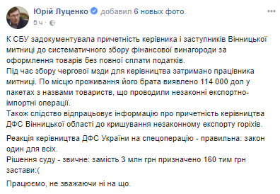 Сотрудники СБУ заявили о причастности руководителя и заместителей Винницкой таможни к систематическому сбору материального вознаграждения за оформление товаров без полной уплаты налогов. Об этом сообщил генеральный прокурор Украины Юрий Луценко на своей странице в Facebook.