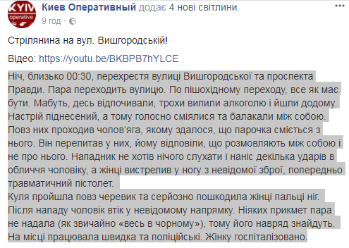 "Ночь, около 00:30, перекресток улицы Вышгородской и проспекта Правды. Пара переходит улицу. По пешеходному переходу, все как полагается. Видимо, где-то отдыхали, немного выпили алкоголя и шли домой. Настроение приподнятое, а потому громко смеялись и говорили между собой. Мимо проходил мужчина, которому показалось, что парочка смеется над ним.