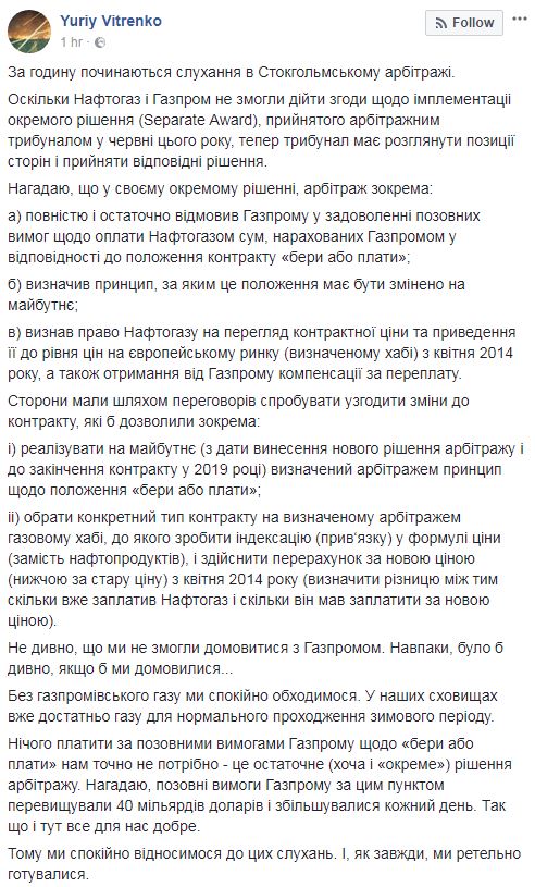 "Начинаются слушания в Стокгольмском арбитраже. Поскольку "Нафтогаз" и "Газпром" не смогли прийти к согласию относительно имплементации отдельного решения (Separate Award), принятого арбитражным судом в июне этого года, теперь суд должен рассмотреть позиции сторон и принять соответствующие решения", - написал он.