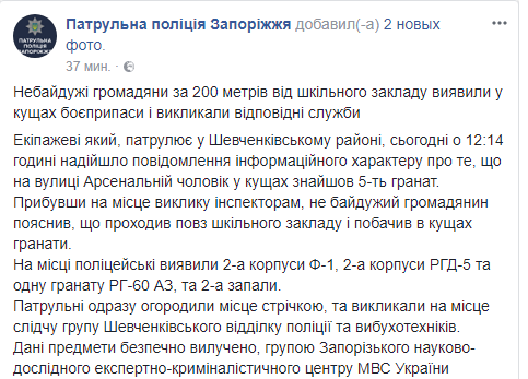 В Запорожье сегодня днем на ул. Арсенальной случайный прохожий обнаружил 5 гранат в 200 м от школы. Об этом сообщает пресс-служба патрульной полиции Запорожья в Facebook.