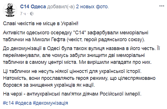 В Одессе осквернили мемориальные таблички в честь Героя СССР разведчика Николая Гефта, облив их краской. Об этом сообщается на Facebook странице одесской ячейки националистической организации "С14", которые взяли на себя это.