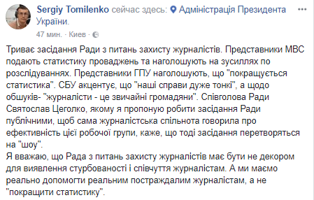"Продолжается заседание Совета по вопросам защиты журналистов. Представители МВД подают статистику производств и акцентируют внимание на усилиях по расследованиям. Представители ГПУ отмечают, что "улучшается статистика". СБУ подчеркивает, что "наши дела очень тонкие", а что касается обысков у представителей прессы, то "журналисты - это обычные граждане", - написал Томиленко.