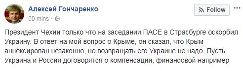 "Президент Чехии только что на заседании ПАСЕ в Страсбурге оскорбил Украину. В ответ на мой вопрос о Крыме, он сказал, что Крым аннексирован незаконно, но возвращать его Украине не надо. Пусть Украина и Россия договорятся о компенсации, финансовой например", - написал он.