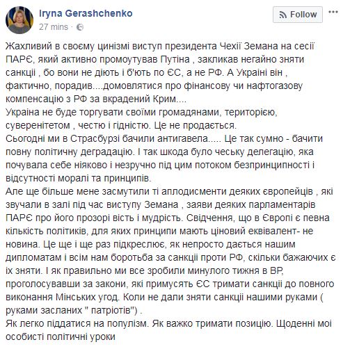 Возмутилась высказываниями Земана и Ирина Геращенко. Она подчеркнула цинизм лидера Чехии и заявила, что он на сессии ПАСЕ лоббировал интересы Путина.