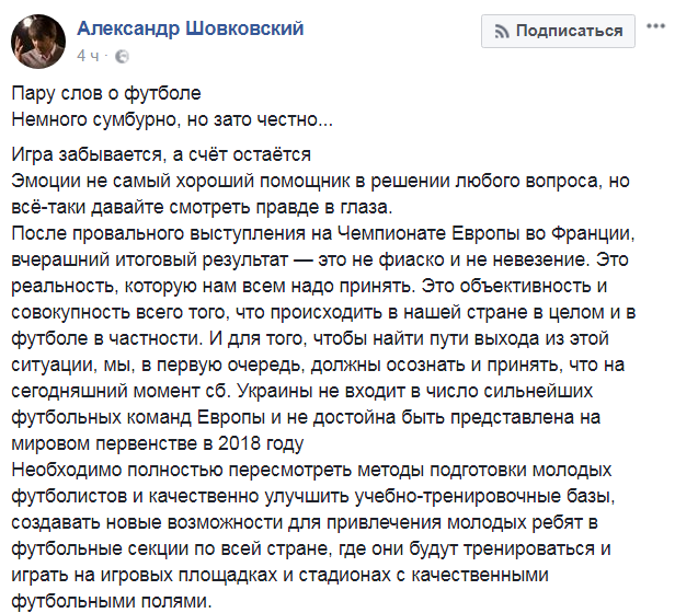 "Немного сумбурно, но зато честно... Игра забывается, а счет остается. Эмоции – не лучший помощник в решении любого вопроса, но все же давайте смотреть правде в глаза", - написал Шовковский на своей странице в Facebook.